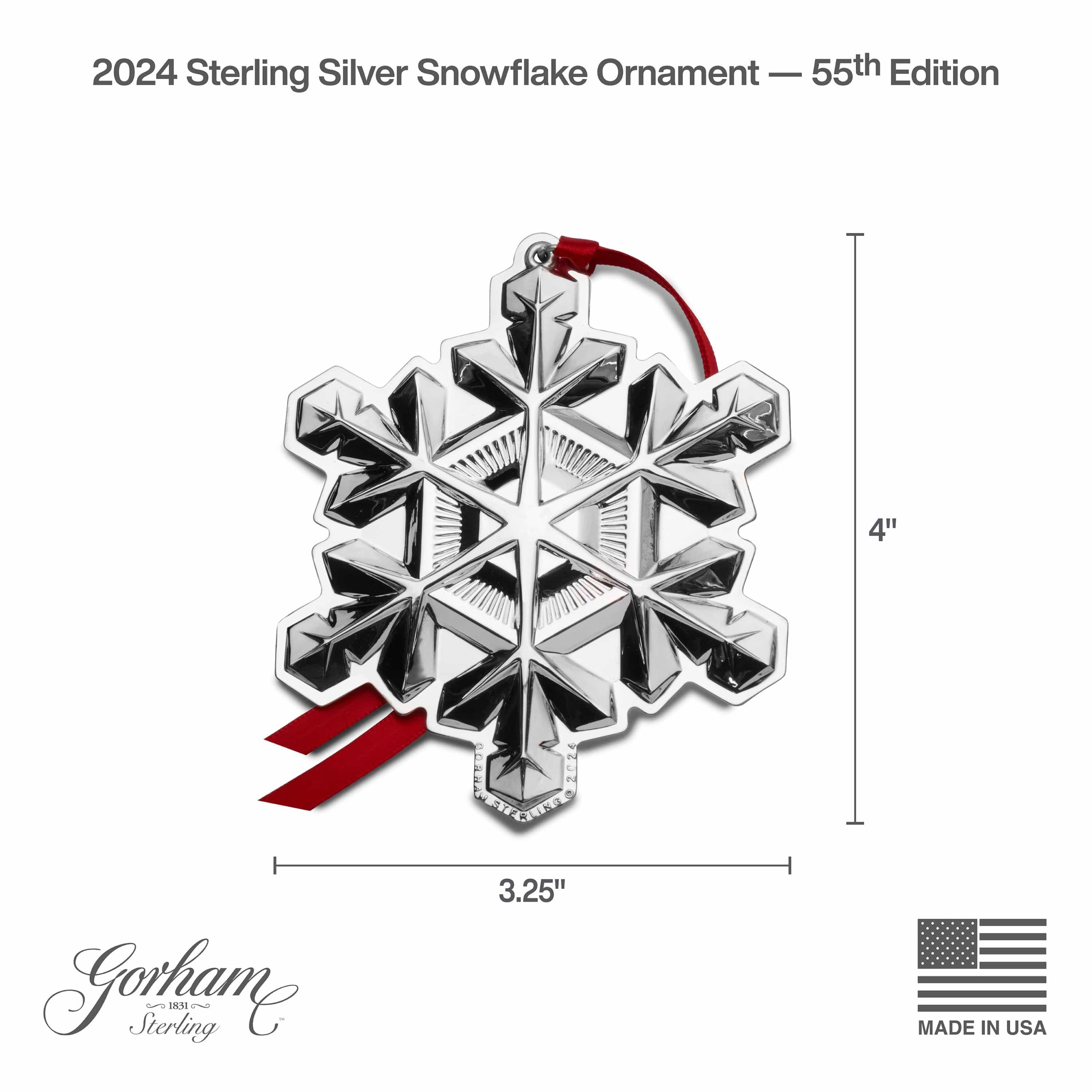 This heirloom quality sterling silver Gorham Snowflake Ornament will add a beautiful touch of joy to a holiday gift. tree or mantel. This is the 55th edition of our treasured annual collectible. Comes in a gift box.includes a ribbon and protective velvet pouch. Handcrafted by skilled silversmiths in the USA. The ornament is stamped Gorham Sterling 2024. and has the same design on both sides.