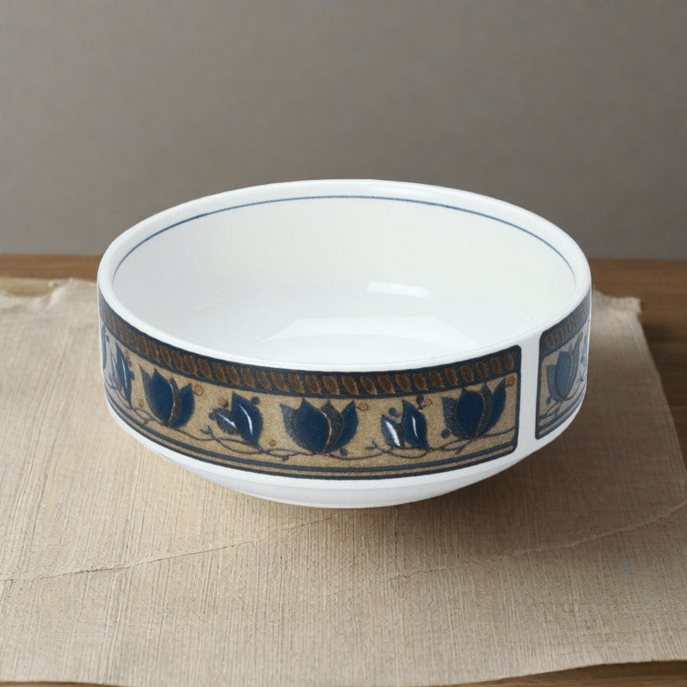 This elegant casual stoneware dinnerware has been a favorite since its introduction in 1986. The bold stylized navy blue tulips and vines on a rustic background flow around each of the pieces. Add the creamer and sugar. oval covered casserole. or any of the accessory pieces to expand your elegantly casual table. And once the dinner is over. all the pieces can go in the dishwasher for easy clean up. The pattern is also oven safe. microwave safe and freezer safe. Soup cereal bowl measures 6-1/4 inch diameter and holds 22 ounces.