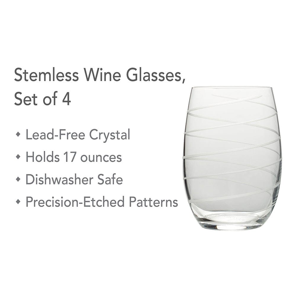 The fun and whimsical designs of the Cheers collection set a festive mood at any gathering. The dots lines and swirls are distinctive and set an attractive table setting. Each glass in the set of 4 is precision-etched with a different yet coordinating design. The dots. lines. and swirls are also distinctive. so each of your guests can easily identify their glass. Dishwasher safe. Set of 4 stemless wine glasses. each measures 4-3/4 inch high x 3-3/8 inch diameter and holds 17 ounces.