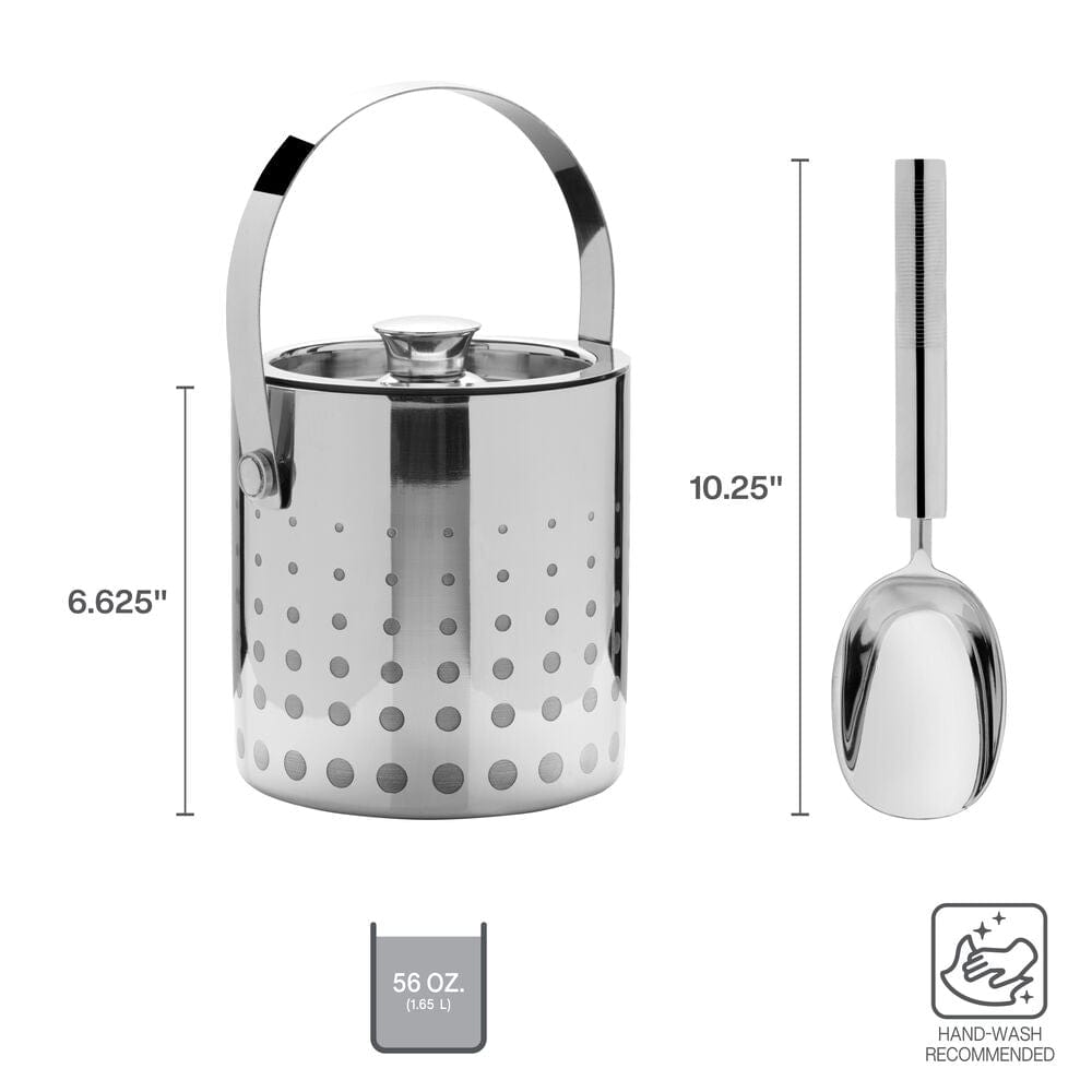 The fun and whimsical designs of the Cheers collection set a festive mood at any gathering. Infuse a little whimsy into cocktail hour with Mikasas unique Cheers barware collection. This attractive stainless steel. double-walled ice bucket is adorned with dots while the ice scoop has fun lines throughout its handle. Perfect for home entertaining or gift giving. Hand wash. Ice bucket measures approximately 6-5/8 inch high. ice scoop measures 10-1/4 inch long.