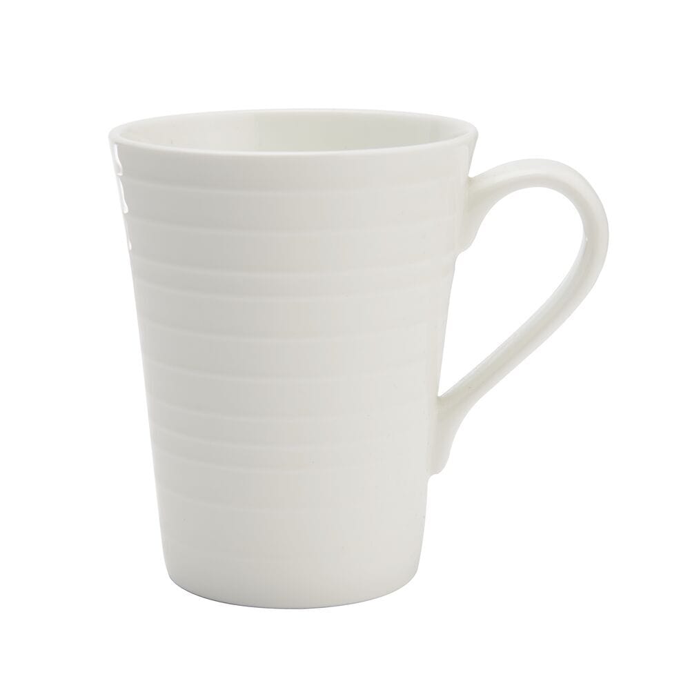 This Set of 4 Ciara Mugs of crisp white Bone China adds a distinctly modern touch to your place settings. and the exterior of each mug features an embossed. swirling line design.?