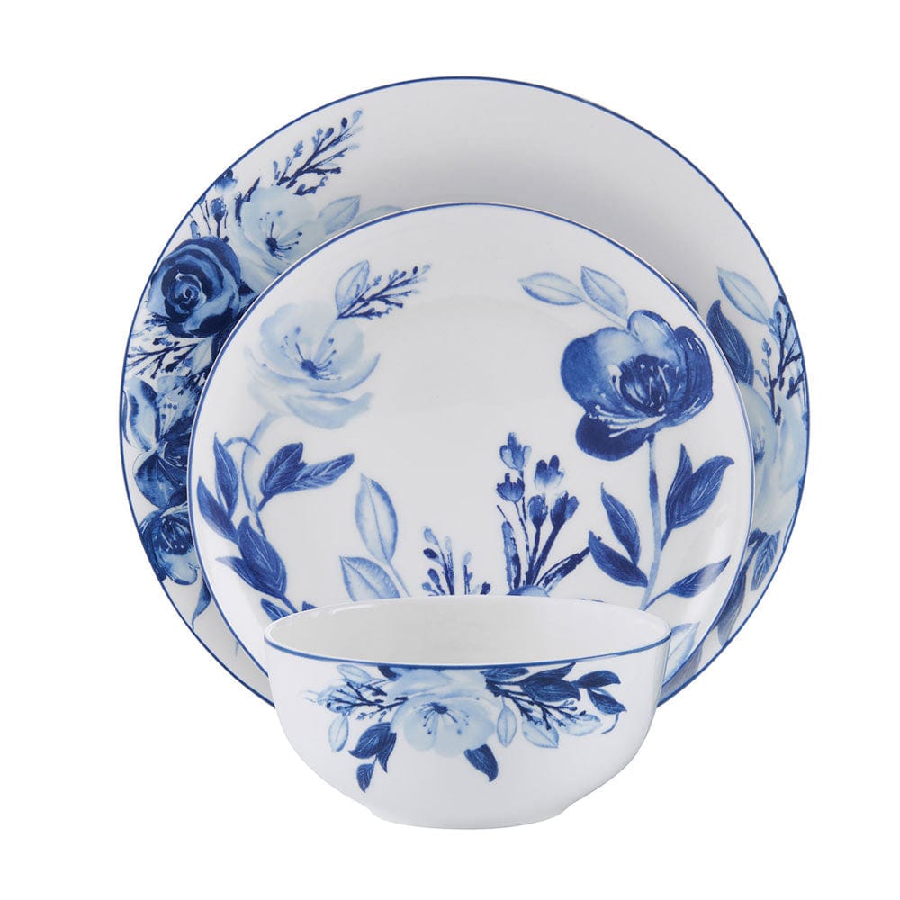 This Darcy Dinnerware Set is adorned with a vivid blue floral pattern that dances across the surface of each piece. with a thin blue line framing the edge of the rims. highlighting the design and making the dinnerware pop on your tabletop.