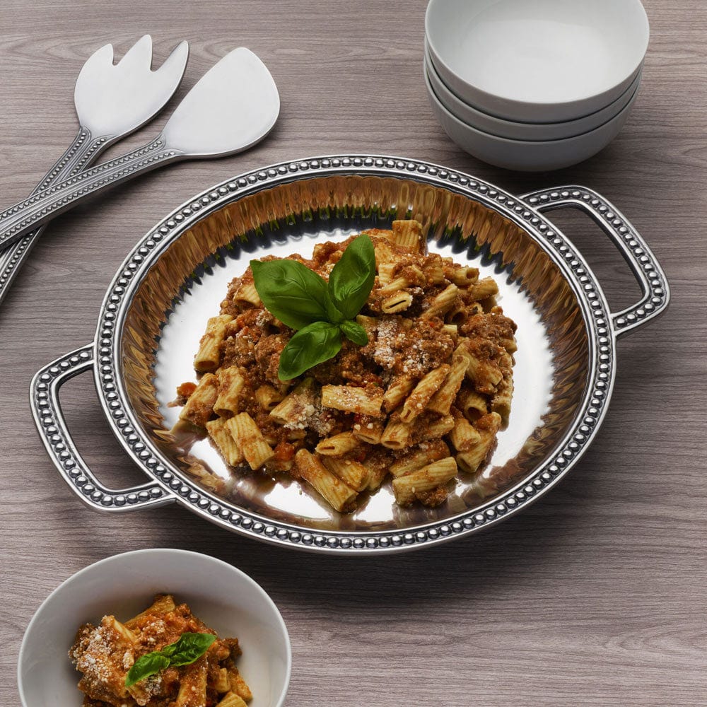 This Wilton Armetale? Flutes & Pearls Low Handled Tray features a traditional fluted design surrounded by a delicate beaded outer edge. Wilton Armetale? Serveware is ideal for your cooking needs. food stays hot longer and perfect for oven. stove or grill. Designed and crafted by hand. these beautiful products were made to last a lifetime.