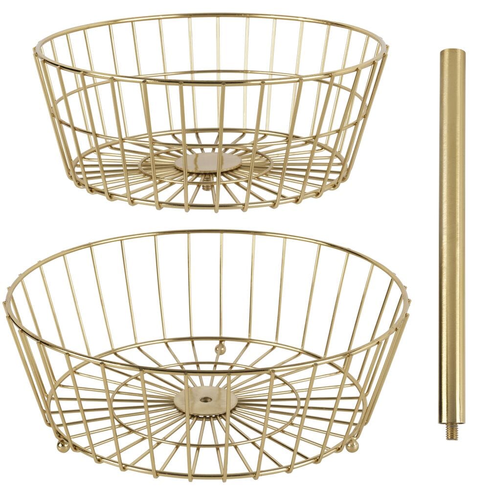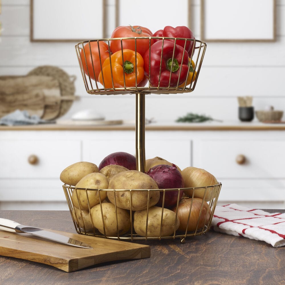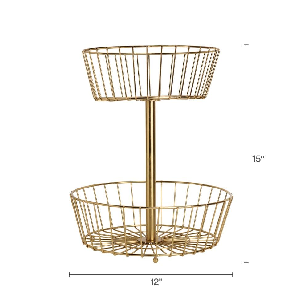 This Gourmet Basics Geneva Gold 2-Tier Basket features a wire frame structure with a stunning gold finish. The space-saving 2-tier design allows you to store more items in limited spaces. Use the baskets to display fruit. to serve muffins and bagels. or as a catch-all to keep small essentials within reach. Strong and durable. the basket is handcrafted from iron for long-lasting beauty. even under rigorous use.