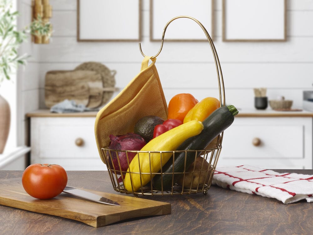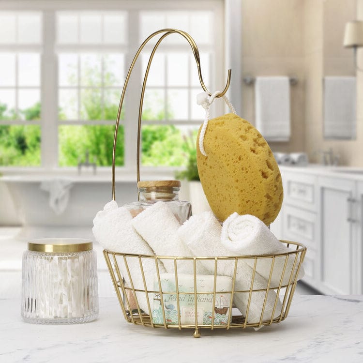 This Gourmet Basics Geneva Gold Fruit Basket with Banana Hook features a wire frame design with a stunning gold finish. The space-saving design allows you to store more items in limited spaces. The incorporated banana hook promotes even ripening of bananas and can also be used to hang grapes. other hanging fruits. and vegetables. and the wire frame design lets fruits and vegetable breathe and makes them visually appealing. Strong and durable. the basket is handcrafted for long-lasting beauty. even under rigorous use.