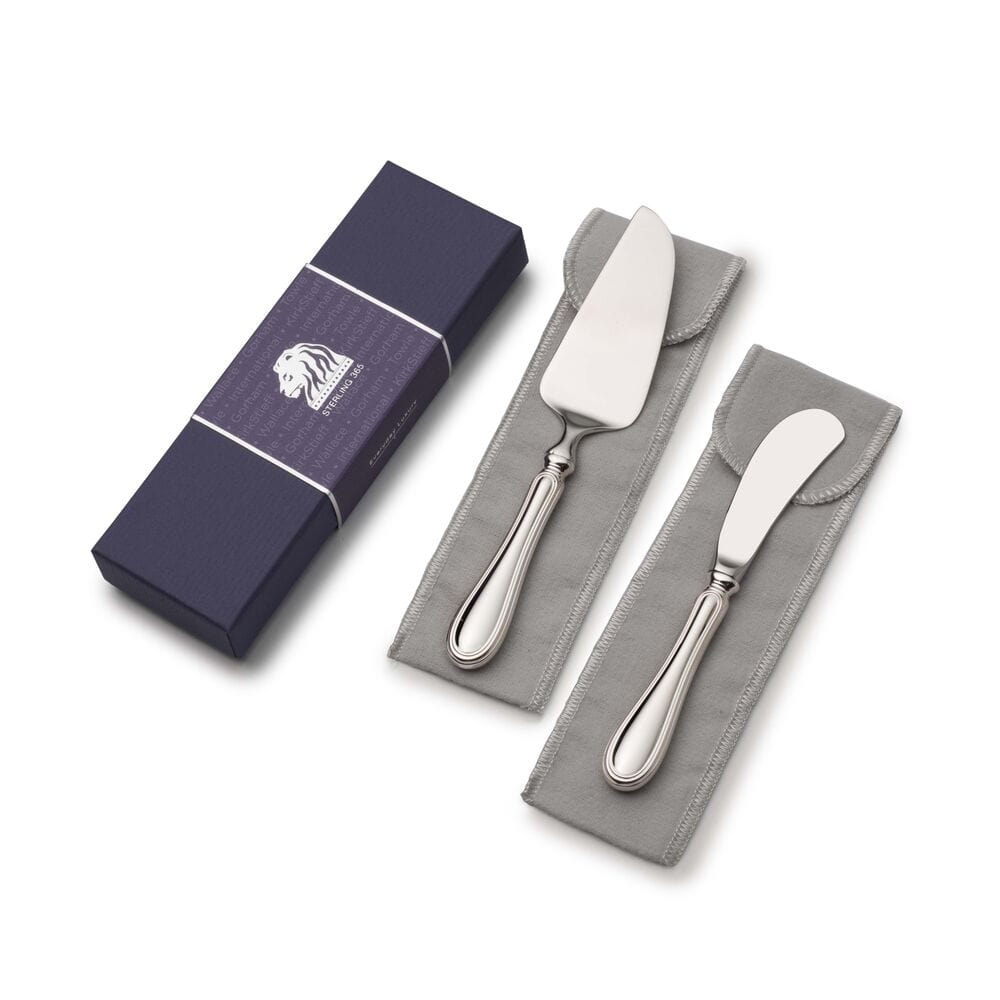 ? 2 piece set includes 1 each: Cheese Knife measuring 7-1/4 inches and Spreader measuring 6 inches ? Handcrafted Sterling Silver handles. high polished mirror finish ? Dishwasher safe. handwashing recommended ? Includes gift box and storage pouch ? Made in America