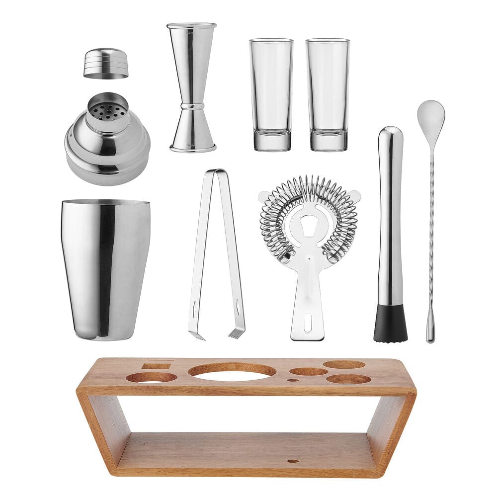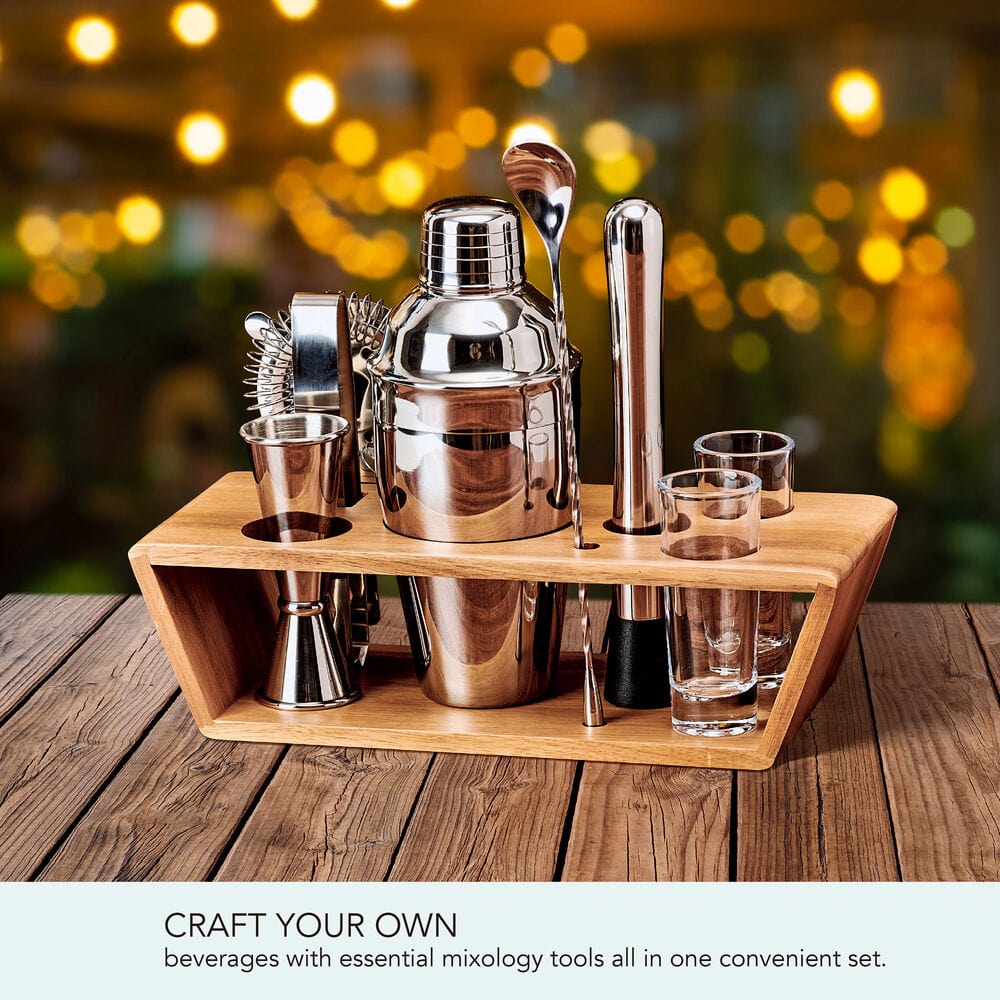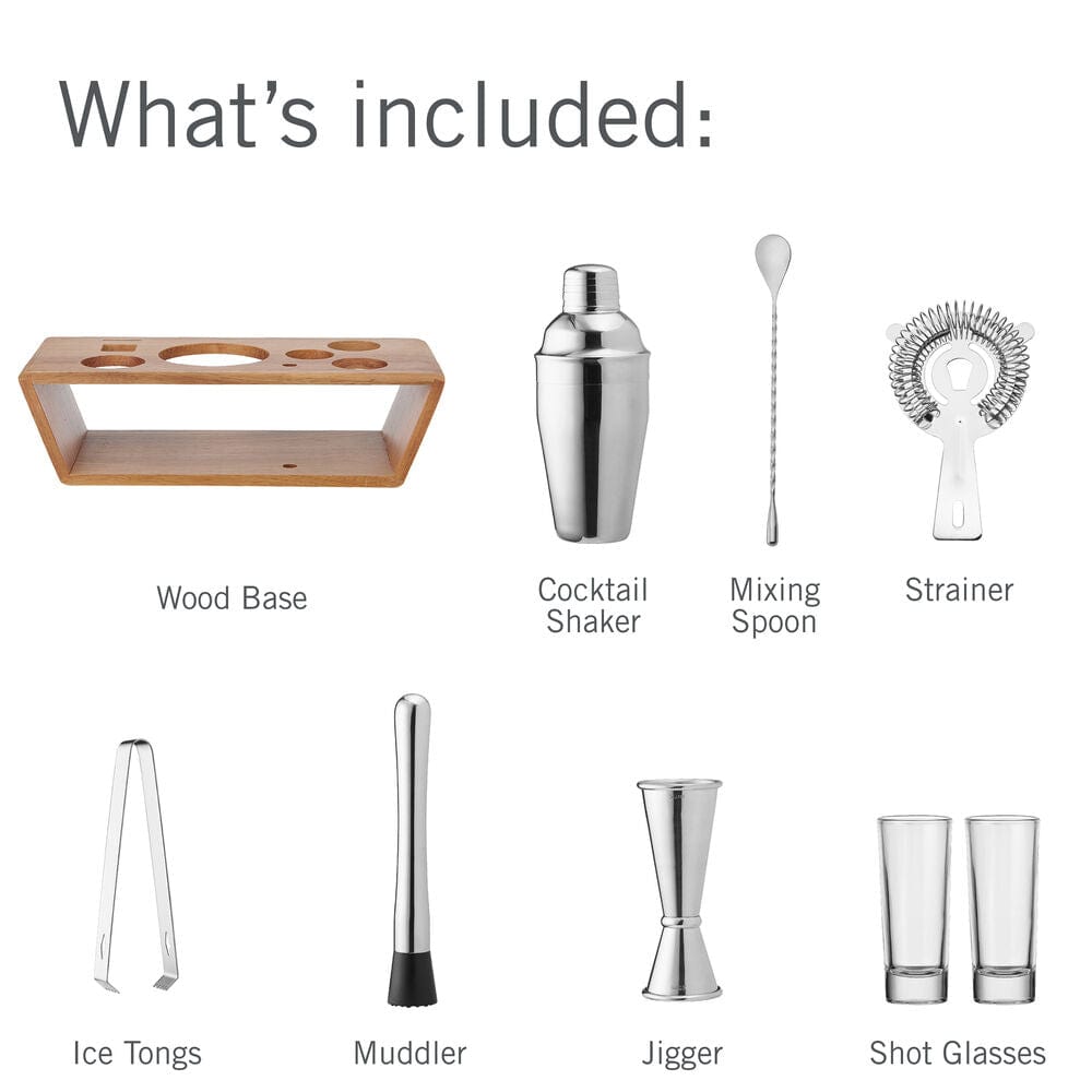 This strikingly elegant 8-piece Glenwood Bartool Set is ideal for entertaining and makes a visual impression on a home bar or buffet table. The set includes all the necessary tools for mixing. stirring. shaking. and preparing drinks and cocktails. all kept neat and organized in the stylish acacia wood base. which holds the sleek stainless steel tools and shot glasses for a look that is modern and sophisticated.