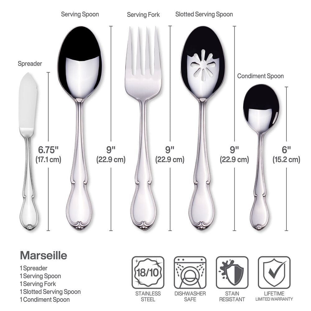 This Marseille flatware set effortlessly complements both modern and traditional table settings. adding a refined touch to any dining occasion. Its versatile design allows it to seamlessly blend with a wide range of table styles. whether you’re hosting a contemporary gathering or a more classic. timeless dinner. This flatware enhances the visual appeal of your table. while its polished finish harmonizes beautifully with any stemware or dinnerware. elevating the overall dining experience and making it suitable for every occasion. from casual meals to special celebrations.