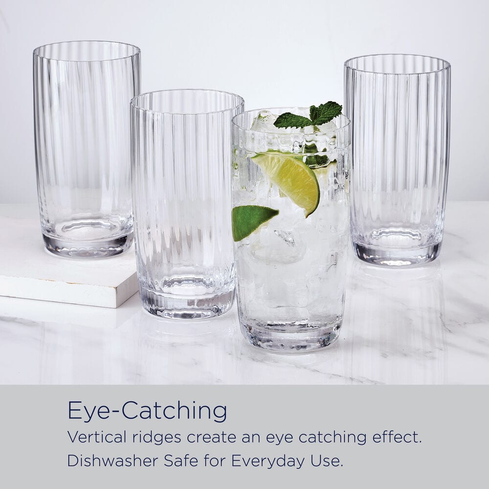 Tall and trendy. this Set of 4 Optic Highball Glasses catches the eye with a textured vertical line design that adds visual interest and enhances the tactile feeling of the drinkware. Highball glasses bring modern appeal to your dining table or home bar. and are ideal for serving mixed cocktails.