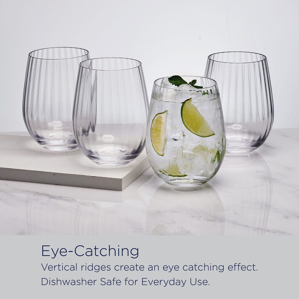 Trendy and versatile. this Set of 4 Optic Stemless Wine Glasses catches the eye with a textured vertical line design that adds visual interest and enhances the tactile feeling of the drinkware. Perfect for bringing a modern twist to enjoying wine. they can also be used as traditional. double old-fashioned glasses to serve beverages