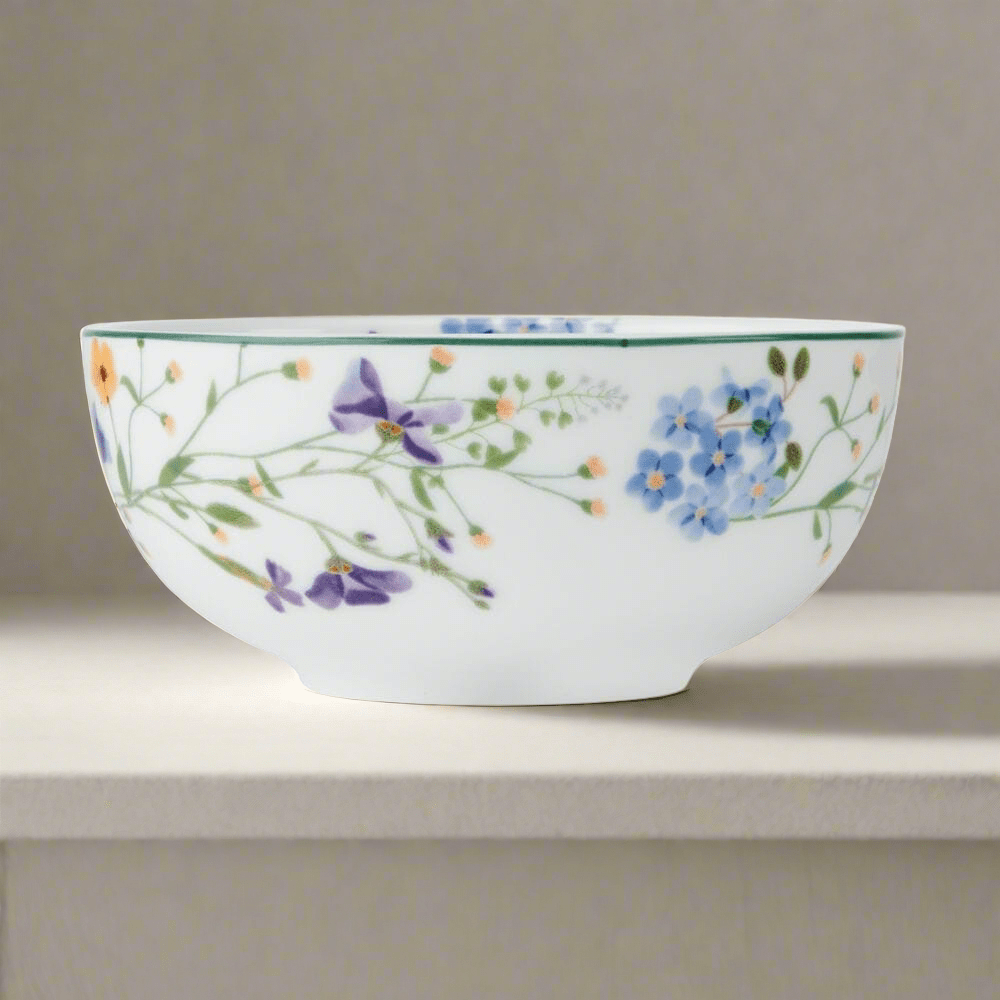 This Quinn Fruit Bowl features a vibrant blue. orange. and purple floral design on crisp white bone china. This pattern brings a touch of garden-inspired artistry to everyday meals. Made of high quality bone china. this fruit bowl exudes sophistication and durability.