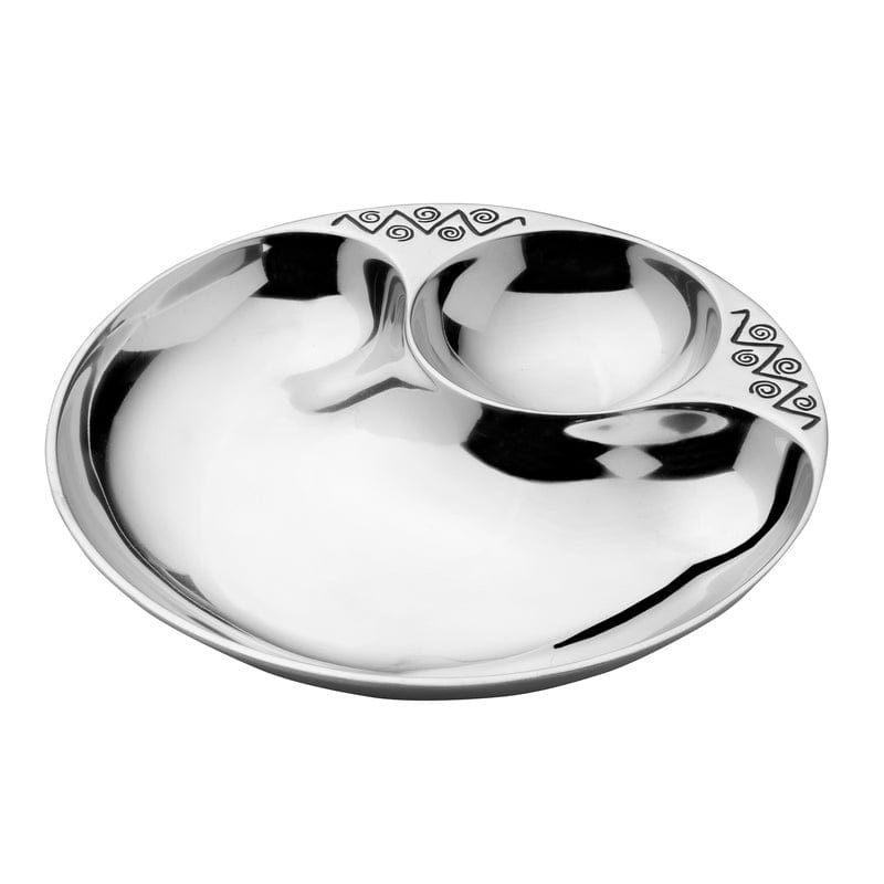 ? Chip and dip measures 10 1/2-inches in diameter and sits 1 1/2-inches high ? Made of Armetale metal. which is an aluminum-based alloy metal. that is 100% recycled. and food-safe ? This piece will not rust. break. crack or chip under normal usage. Wilton products are oven to stovetop to freezer to refrigerator to table ? Hand wash with a soft sponge or cloth and mild soap and warm water. Do not place in automatic dishwasher. Detergents. harsh chemicals and hard water will harm the metal’s finish