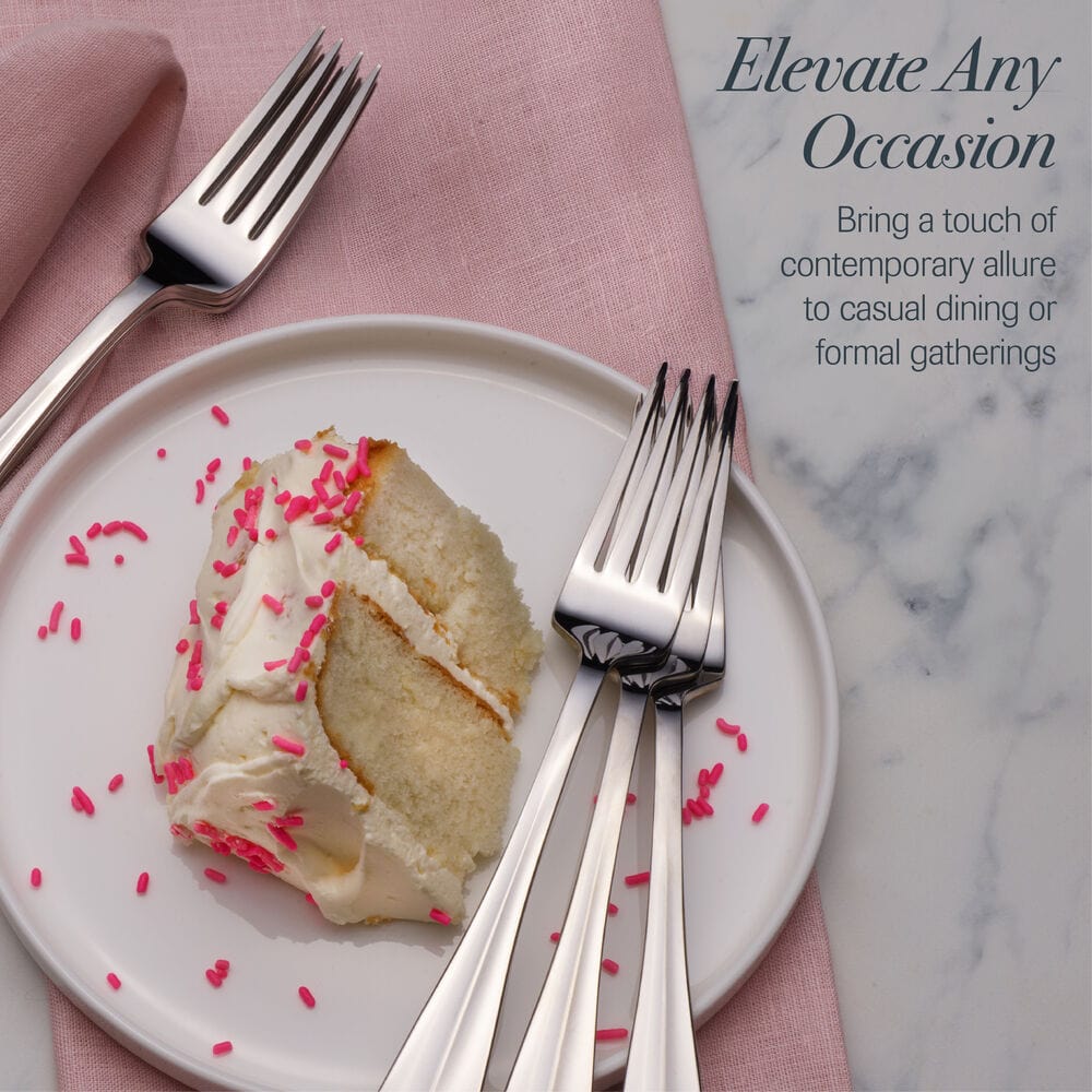 These Wallace Riggs Set of 6 Dinner Forks are stunningly crafted for long-lasting beauty. The modern. sleek forks feature classic teardrop-shaped handles with bold curves and a distinct raised vertical line down the center.
