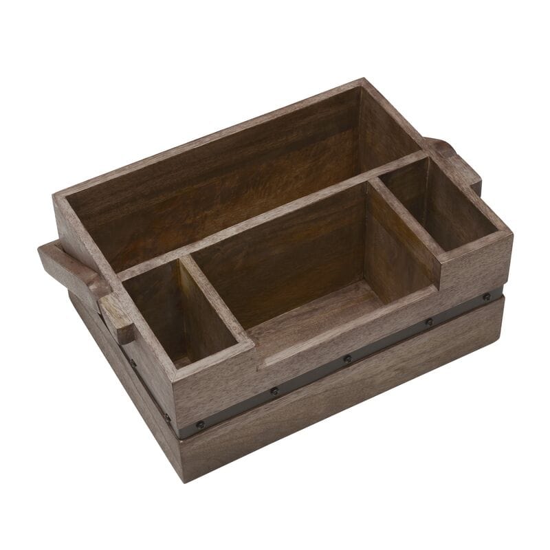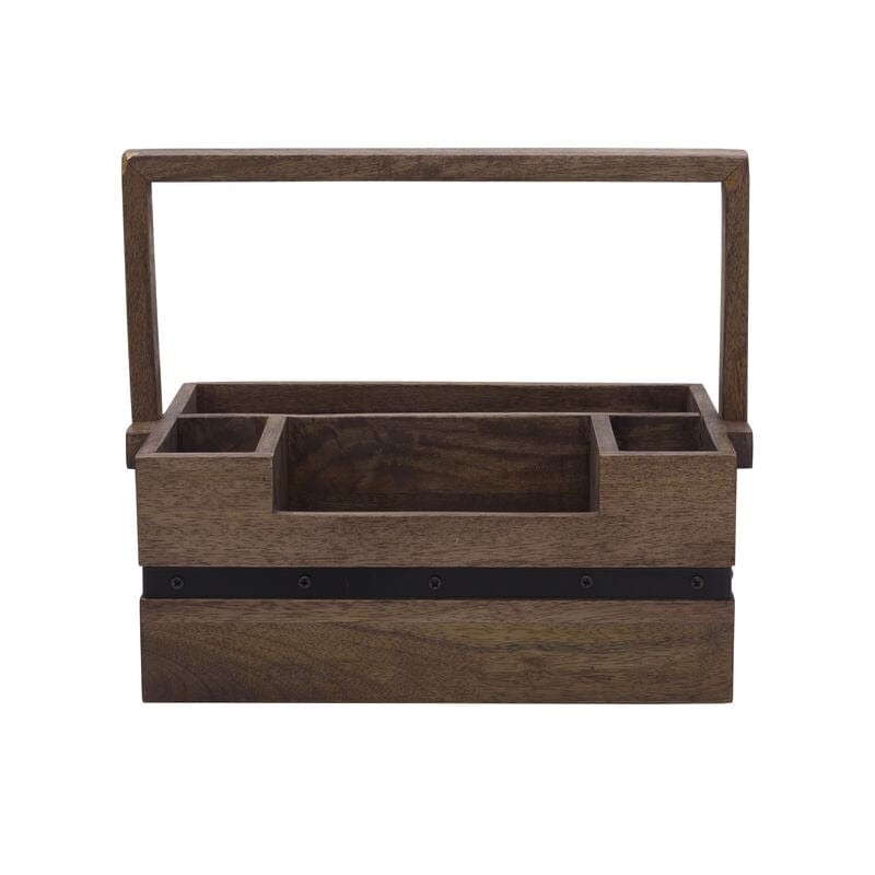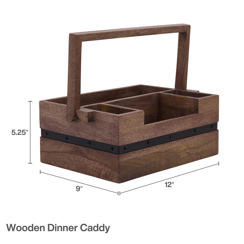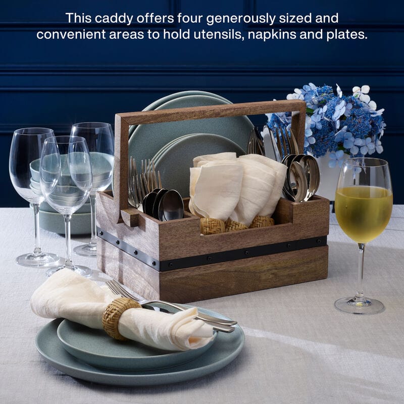 This all natural mango wood dinner caddy will make a great addition to your next party or family gathering. This caddy offers four generously sized and convenient areas to hold utensils. napkins and plates. This is perfect to set out on your buffet table or in your backyard for pool parties or barbeques. Made of mango wood with iron detailing and a handle that allows for easy transport.
