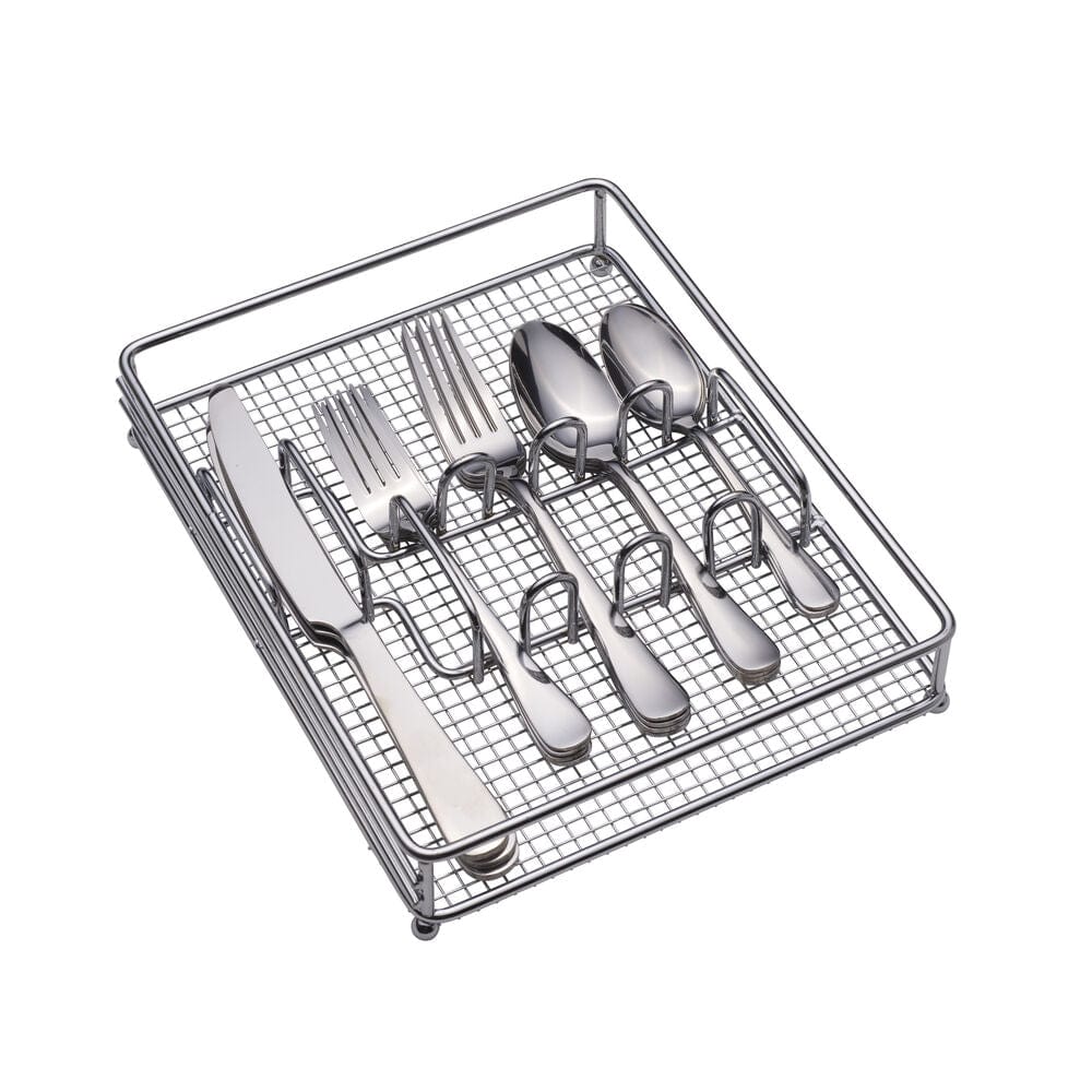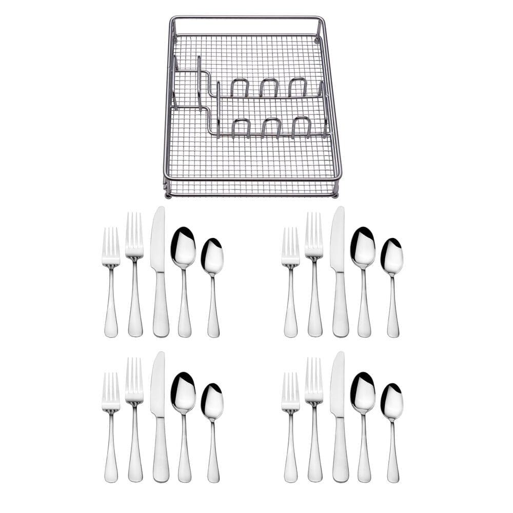 ? 20 Piece includes 4 dinner knives. 4 dinner spoons. 4 dinner forks. 4 teaspoons. 4 salad forks and a wire caddy
